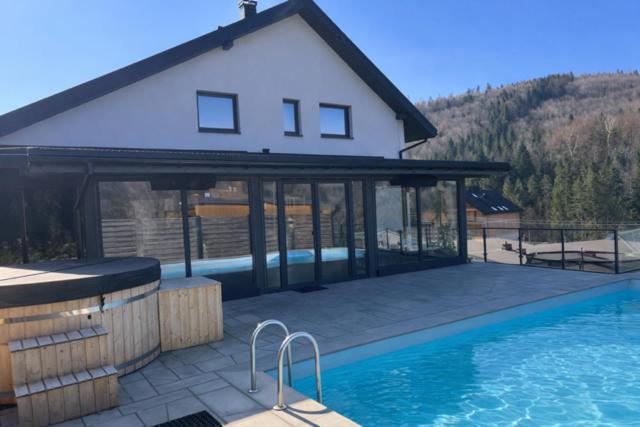 Dom z 5 sypialniami. Guests will have a special experience as this holiday home offers a pool with a view, a hot tub and a sauna. Featuring a private entrance, this air-conditioned holiday home consists of 3 living rooms, 5 separate bedrooms and 3 bathrooms with a bath and a shower. Guests will find a stovetop, a refrigerator, a dishwasher and kitchenware in the fully equipped kitchen. The holiday home also offers a barbecue. The spacious holiday home provides a flat-screen TV with streaming services, a washing machine, a tea and coffee maker, a seating area as well as garden views. The unit offers 8 beds. Dom wakacyjny - 14 osobowy. Powierzchnia pokoju ok.: 213 mkw.
