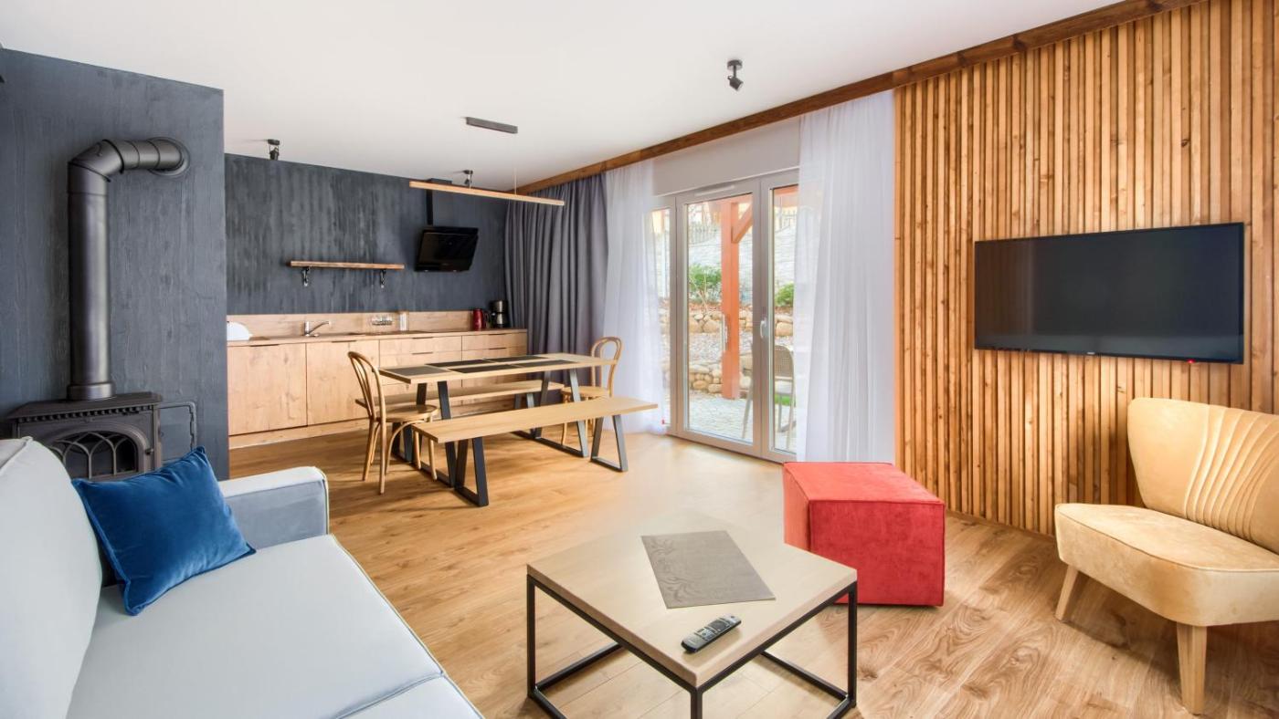 Apartament z 2 sypialniami. Jest to apartament z kominkiem. Apartament ten mieści salon, 2 oddzielne sypialnie oraz łazienkę z prysznicem i suszarką do włosów. Udogodnienia obejmują w pełni wyposażony aneks kuchenny z płytą kuchenną, lodówką, zmywarką do naczyń oraz przyborami kuchennymi. W tym apartamencie z balkonem z widokiem na góry znajduje się ekspres do kawy i telewizor z płaskim ekranem. Ta opcja zakwaterowania zapewnia 4 łóżka. Apartament - 6 osobowy. Powierzchnia pokoju ok.: 60 mkw. ;